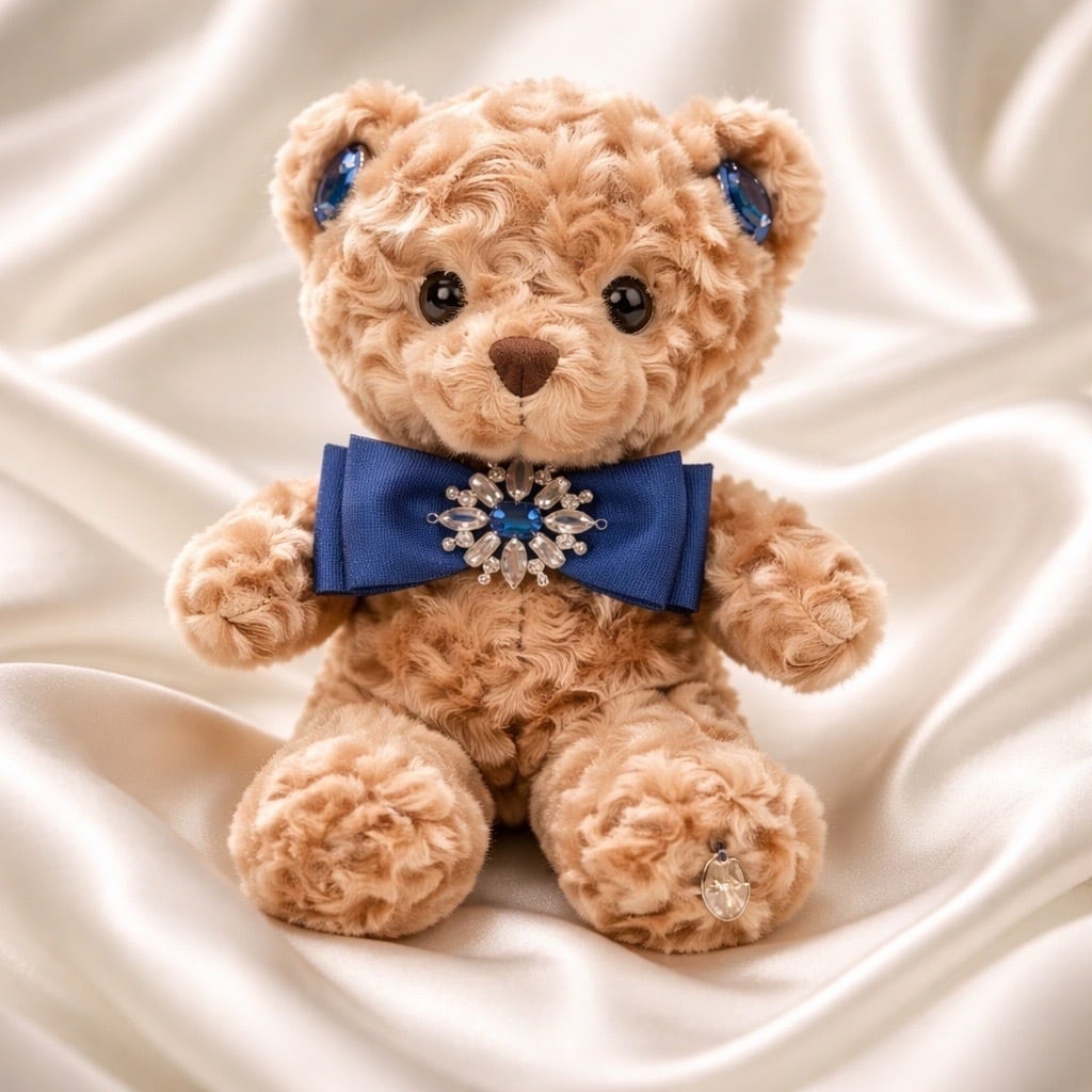 ヴェルサイユコレクション★Vol.1 ベアー人形 ブルーサファイヤは、宝石のようなビジューと美しいリボンをあしらった特別なテディベアです。柔らかな手触りと、愛らしい表情が心を癒やし、様々なシーンでのインテリアとしても存在感を発揮します。このテディベアは、大人の心も癒すテディベアを作りたいという思いでお作りしました。