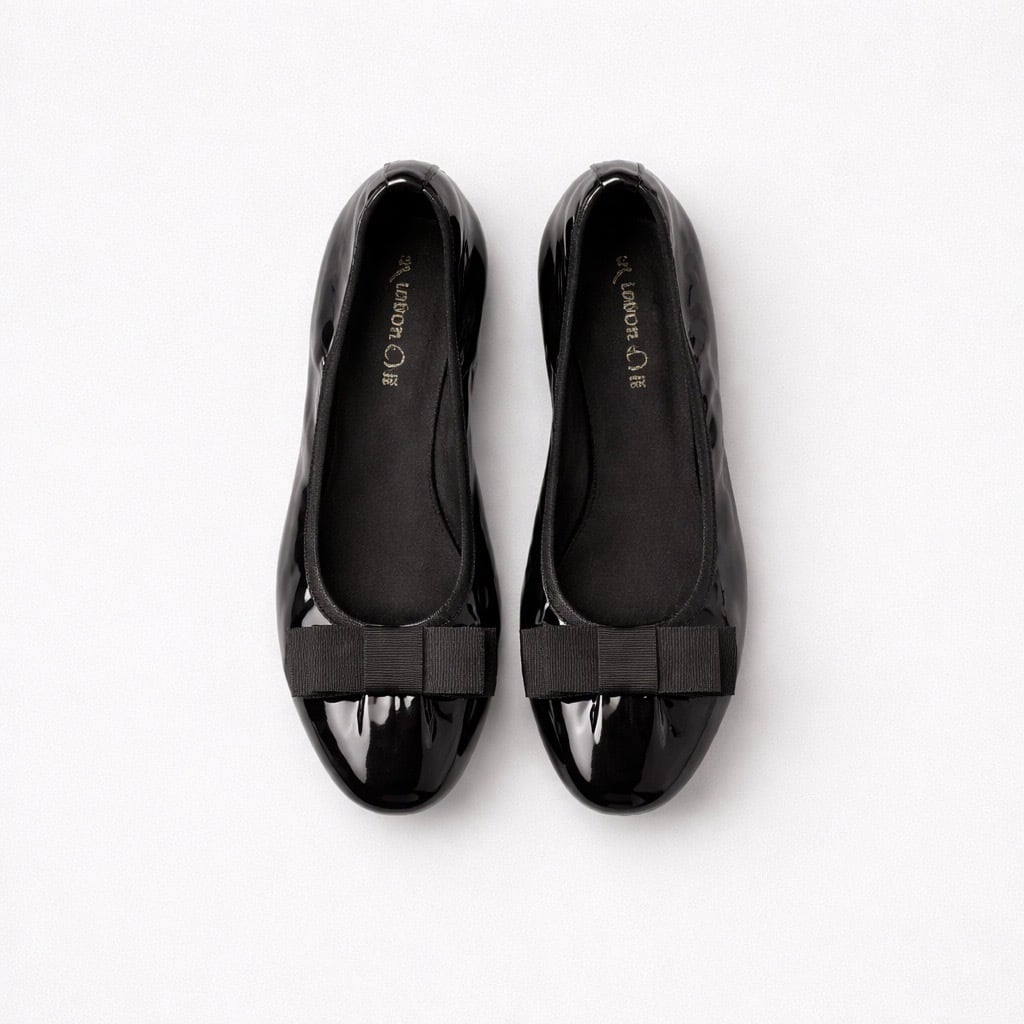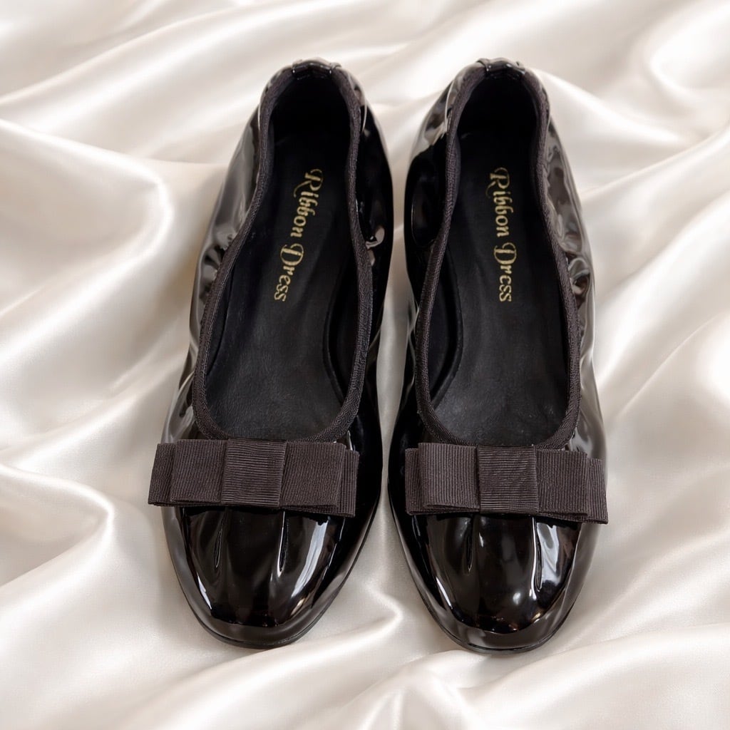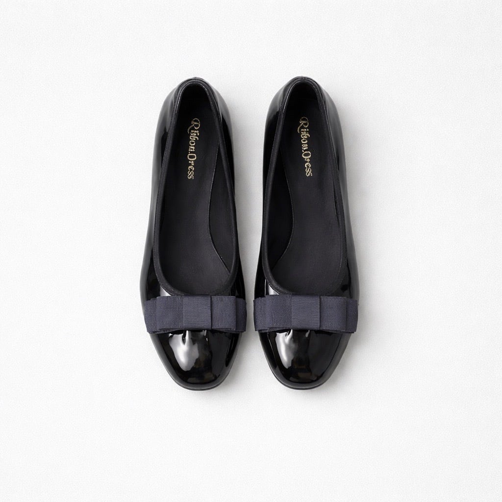 クラシックリボンが施された、弊社の人気アイテム「魔法のエナメルバレエシューズ」の登場です。エナメル素材のボディは、光沢感と上品さを兼ね備えています。さらに、クッション性に優れたデザインで、床からの衝撃をしっかり吸収するため、長時間の使用でも足が疲れにくいのが特徴です。